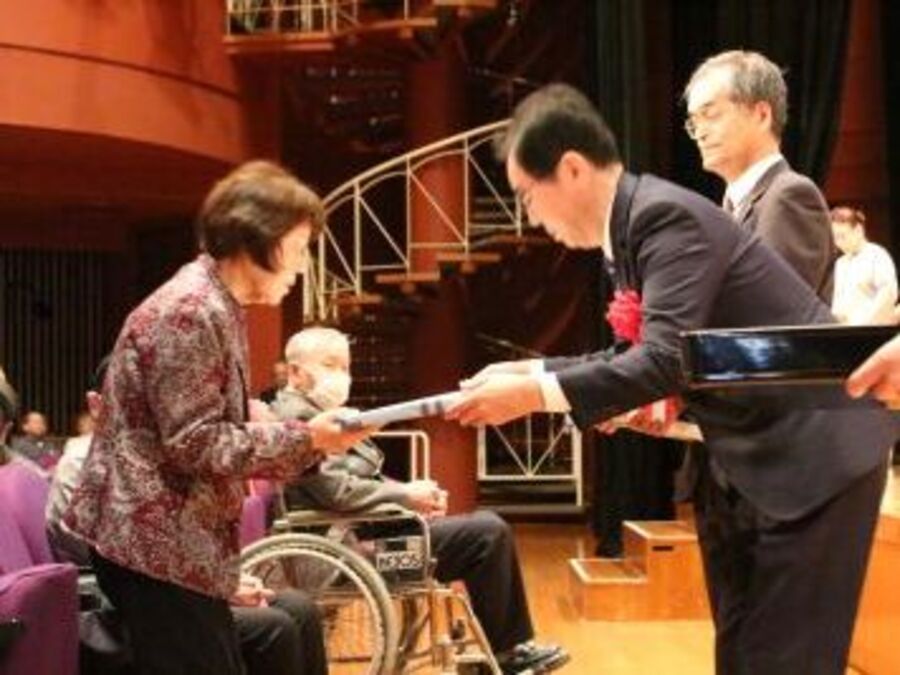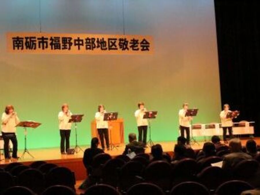 75歳以上が対象で、約130名の高齢者が出席。ハッピースマイルによるオカリナ演奏で幕を開け、第1部の式典では米寿を迎えられた4名(対象は20名)の方々に南砺市と福野中部まちづくり協議会から賞状と記念品が贈呈されました。