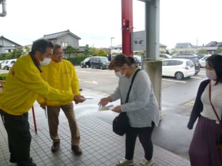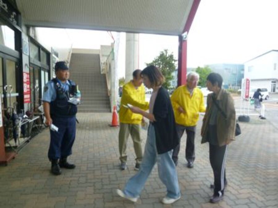 あいにくの小雨模様でしたが、ショッピングア・ミューの入口3か所でのぼり旗を立て、カギかけの必要性を訴えるチラシとティッシュを配布したところ、大勢の買い物客が快く手に取ってくれました。