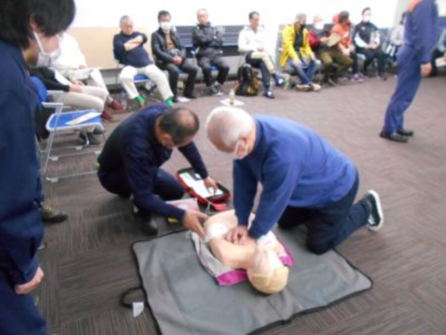 心臓マッサージのやり方やAEDの使い方などを実際に体験し、終了後は参加者全員が普通救命講習の終了証をいただきました。