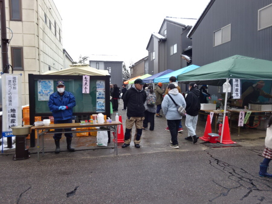 福野の冬の風物詩と言えば、毎年12月27日に通称銀行四つ角周辺で開催される歳の大市です。福野中部まちづくり協議会も上町駐車場で地場産市を出店し、焼きそばと特製のもつ煮を提供しました。