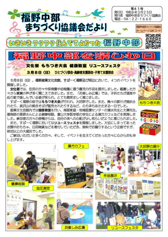 同時開催した文化祭・もちつき大会・健康教室・リユースフェスタの模様と、男女共同参画アンケート集計結果を掲載しています。